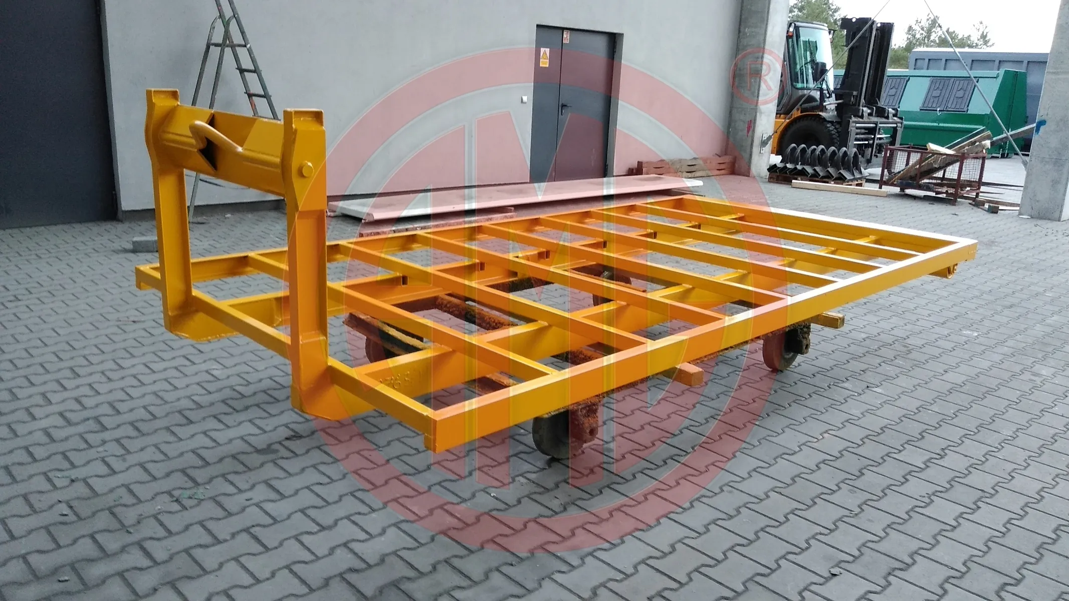 Front: Auhanmebuye aus Aufnahmebügel aus Stahl, Gute ST 52-3, warm gebogen, Ø 30mm, Hakenaufnahmesystem vorgebaut, 2 Stück vertikale Träger INP 100, in den Unterzugen verstärkt.